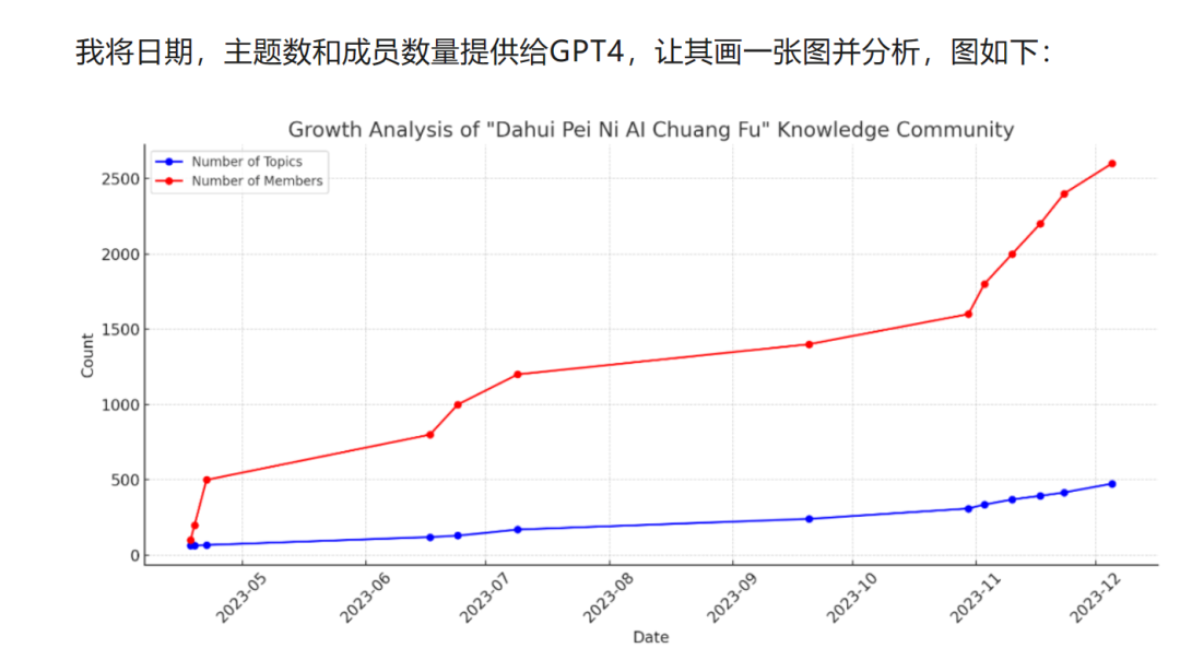 将日期,主题数和成员数量提供给GPT4,让其画一张图并分析,如下: