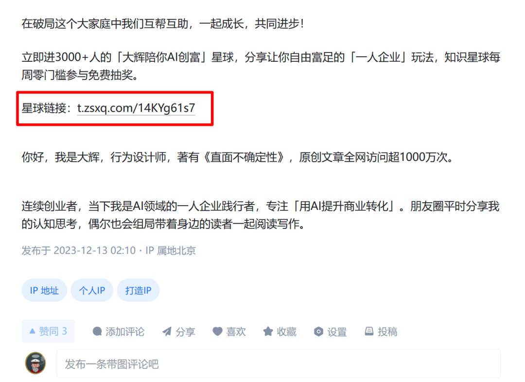 在公域,比如知乎,放二维码会被屏蔽,但用星球主页链接就没有问题。类似这样: