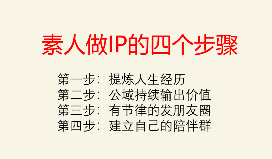 今天分享的主题是素人做IP的四个步骤,这套方法,即使你现在没有一个粉丝,没有产品,马上就可以开始,塑造个人IP的同时,也能赚到钱。