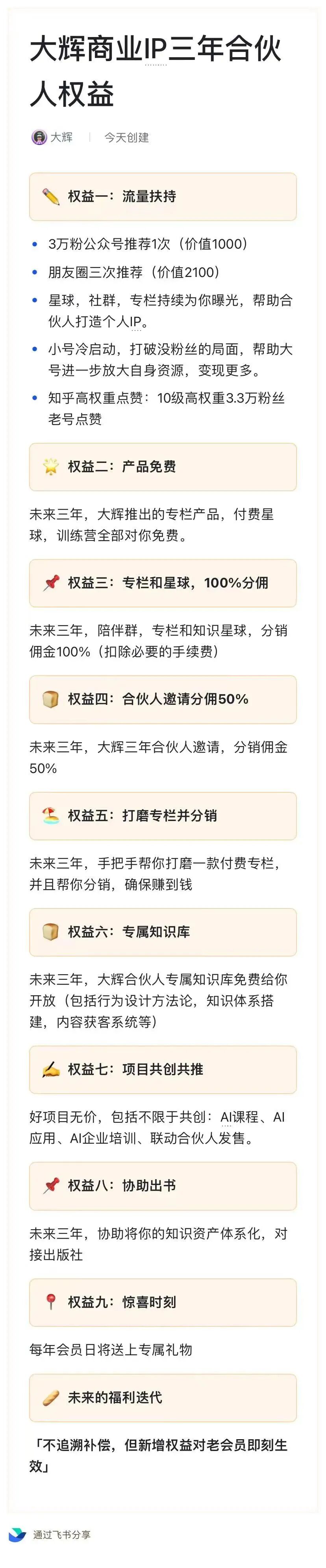 除此外,还有三年IP合伙人权益赋能。6、大辉商业IP三年合伙人权益