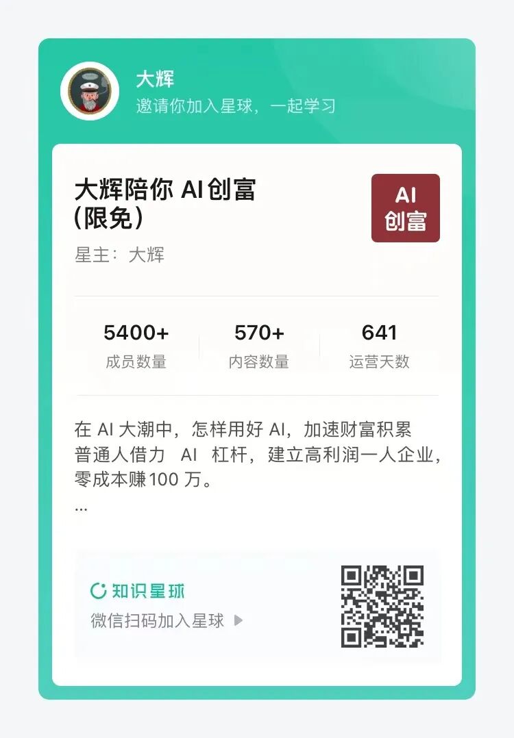 立即进5400+人 的「大辉陪你AI创富」星球,分享让你自由富足的「一人企业」玩法,知识星球每周零门槛参与免费抽奖。