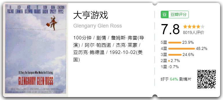 这是一部比CC年龄还要大的片子,当房地产进入萧条的时候,美国房屋中介的销售顾问都在忙什么?看他们如何门到门地将房地产销售出去,如何在萧条期包装房地产,如何瞄准新婚家庭的住房需求。