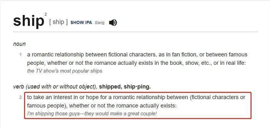 中文中如果说“我嗑xxx和xxx”,那么英文中就可以表达为“I ship xxx and xxx."你肯定会奇怪CP和“船”有半毛钱关系?