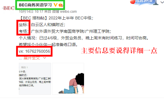 大家还可以通过C姐的个人微博 @BEC商务英语学习 来辅助学习,以及获取备考资料,你可以将自己的考点信息以及联系方式编辑好,然后发送微博并@BEC商务英语学习,我就会及时帮大家转发,人多力量大嘛~