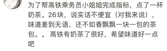 据新闻介绍,高铁奶茶日均能售出3000杯,还常常卖断货,但是看网友的留言,好像大家并不买账,抛开包装不好看之外,味道太淡,26元的奶茶还不如香飘飘一块的茶包