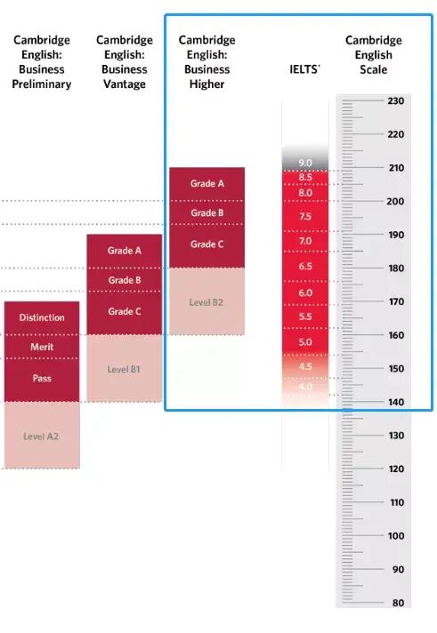 还有一点不得不说就是单词,大学四六级的词汇里似乎都很少涉及金融方面的专业词汇,而BEC几乎通篇都是这样的词汇,剑桥英语考试官方给出的分数标尺如下: