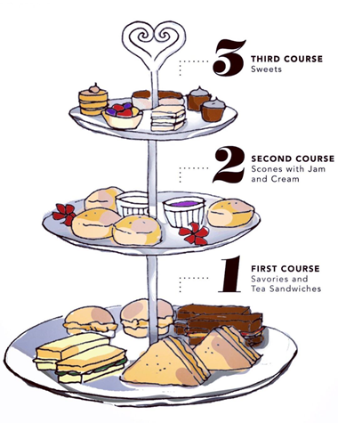 下午茶的茶点和吃法非常讲究。例如,糖块需要由镊子取用,不能用手;主食是立在架子上林林总总的精美蛋糕,还有小块三明治、司康等甜点和水果,就像这样: