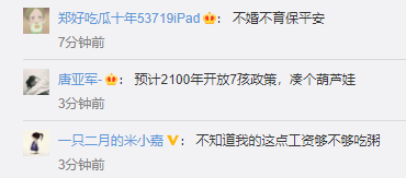 上面网友的评论,成功击中我的笑点,“凑齐七个葫芦娃”什么鬼?不过也是,之前还是放开“二胎”政策,这还没多久呢,就升级为“三胎”了,但是你C还是单身girl