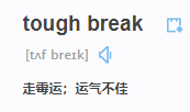 “tough”可以表示艰难困苦的,“tough break”组合起来,看似是“艰难困苦的间歇”,但是哪有这么说话的,你稍微引申一下就会理解;因此,“tough break”就是霉运、恶运的意思。