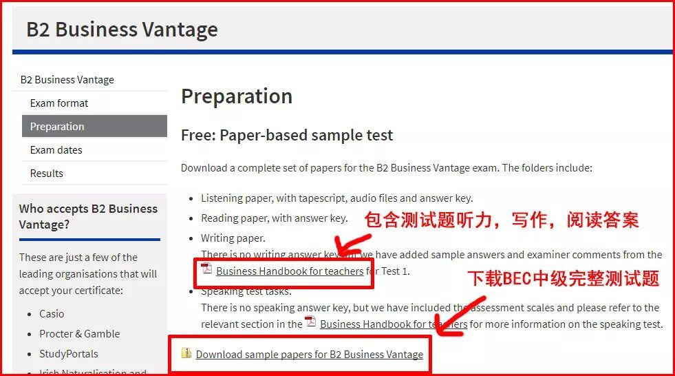 这个项目栏就更厉害了,如果你觉得上一个【Business English Begin test】测试比较狭隘,想感受下真实的商务英语考试题,那你可以进入到这个类目下。找到BEC三个专项,点进去下载一套官方提供的全套BEC真题。