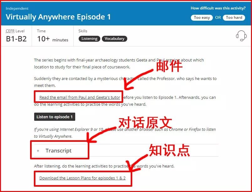 七集中的每一集都穿插了B1-B2级别的知识点。比如第一集,就有很标准的邮件格式,附带听力原文,并且最最重要的是,最后还有第一集中的所有重点的知识点讲解,包含词汇,单词,语法语句等等。