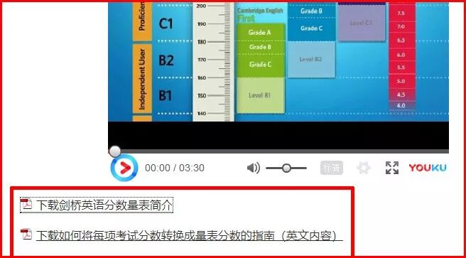 更重要的是【剑桥英语分数量表】页面中,还配有视频讲解(英文),要是你不能完全理解,下方还有专门的中文PDF介绍文件。