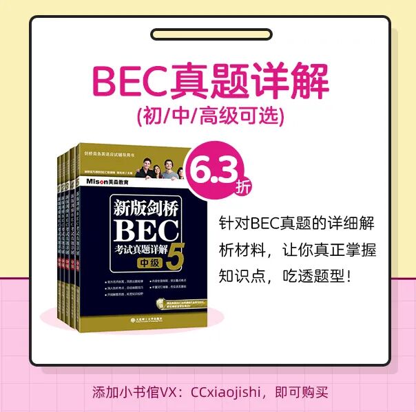 《BEC真题集详解系列》与官方的真题集一一对应。这本书由剑桥官方授权BEC培训师亲自操刀编写,详细权威解析5本真题集。有了它就再也不用担心题目看不懂,做不会了。