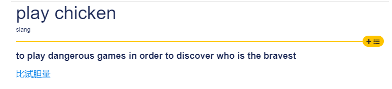 其实chicken除了我们知道的“鸡肉;鸡”的意思,在口语中,它还表示“胆小鬼;懦弱的人”。所以 play chicken 在中文里指的是“胆小鬼游戏”,或者“比试胆量”。跟“玩鸡”可没有任何关系哦!