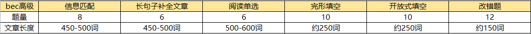 这里以BEC高级和六级的题量和文章长度对比一样,大家可以对比参考一下。