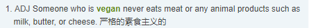 我们先来看,“VG”最常指的是:vegan. 可以翻译为“严格的素食主义者”:
