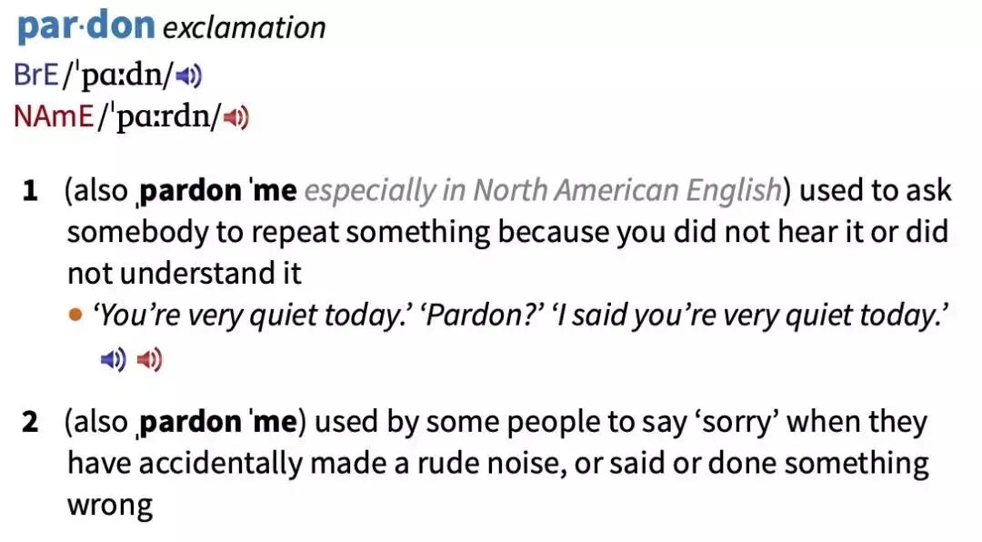 看到这里,有的同学可能会感到疑惑“Pardon”不是我们从小就会用到的单词吗?表示“没听清、再说一遍”吗?