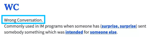 这里的“WC”可不是指“厕所”,而是Wrong Conversation的缩写,来看看《美国俚语词典》的解释: