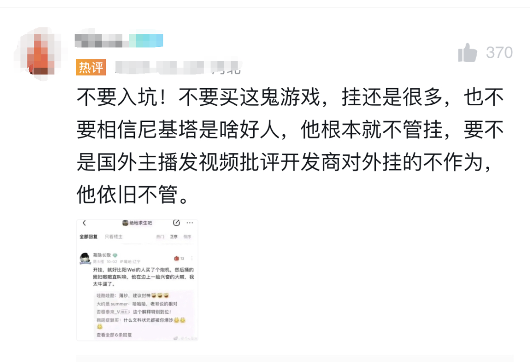 外挂的泛滥和尼基塔的不作为,让玩家的热情被不断消磨,如果你现在去发布一个入坑咨询帖,收获的回复大抵是比较统一的: