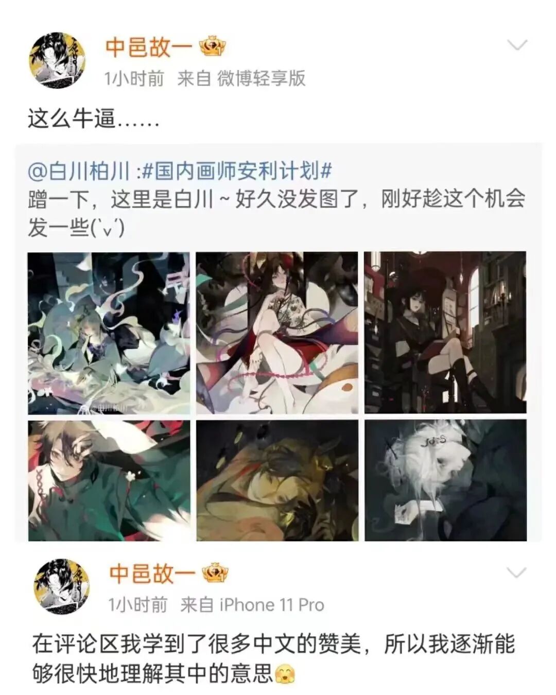 另一方面,这些海外画师很大一部分都是日本画师,而推特上多年以来一直都存在的“伪中国语”,近乎能让他们和中国粉丝进行无障碍的交流。