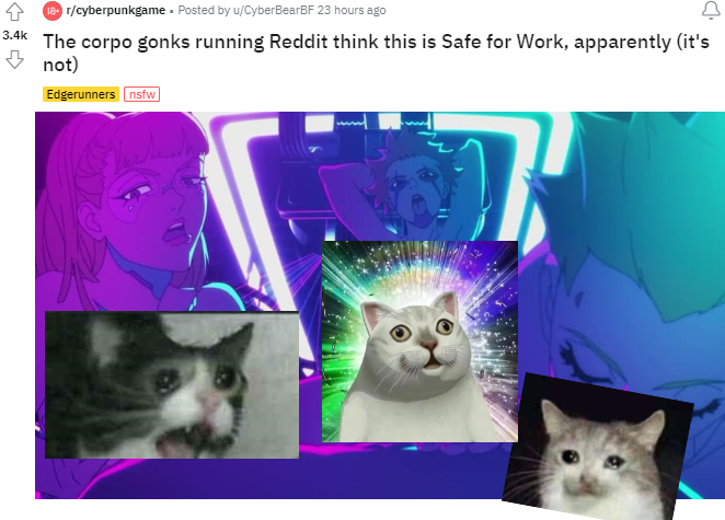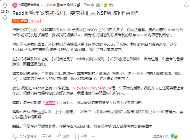在这种风向下,《赛博朋克2077》的版块也以“身为18+游戏,这个版块本来就应该是成人版块”唯由,转向了NSFW。