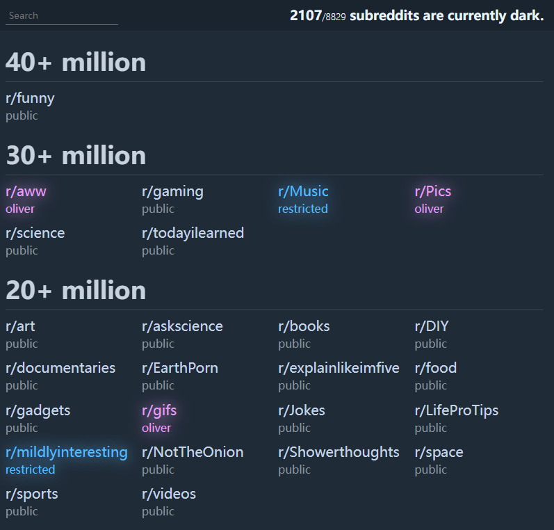 闹得最凶的时候,Reddit总共8000多版块中,最多有个7000+个板块都处于“停电”的状态,包括r/gaming、r/aww、r/Music、r/todayilearned和 r/pics这几个用户数超3000万的版块,差点没把reddit整个平台给直接干瘫痪了。