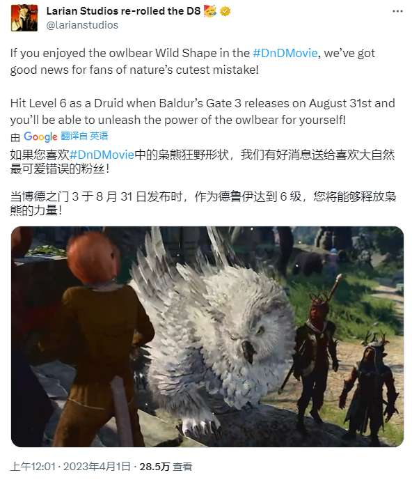 或许是因为呼声实在太高,拉瑞安随后也很贴心的满足了玩家们的愿望——《博德之门3》中的德鲁伊6级就可以变成枭熊了。