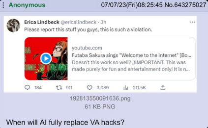 和之前AI绘图的争议一样,这次的配音演员们也和画师一样,联手开始在互联网上发声,以“VA(Voice Actor/Actress,配音演员)>AI”的宣言抵制AI声音的不当利用。
