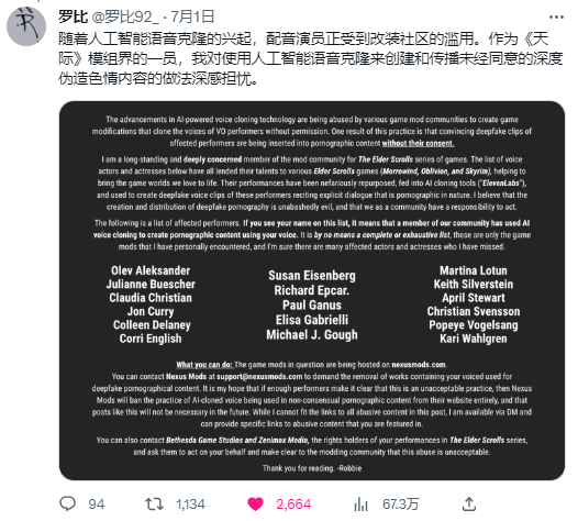 最近,一位Twitter用户Robbie92发布了一篇帖子,控诉起了《上古卷轴5》的Mod社区正在使用AI配音来创建和传播未经本人允许的色情内容。
