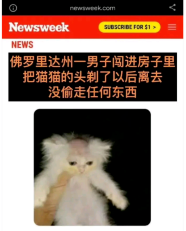 “佛罗里达州一男子私闯民宅,只为给猫猫剃成地中海。”