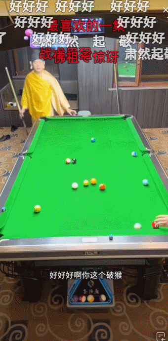 在直播平台上,佛祖正在和孙悟空打一场激烈的台球比赛;