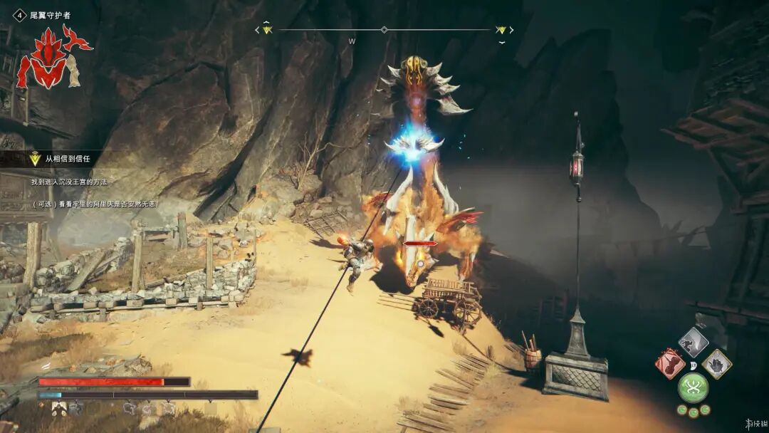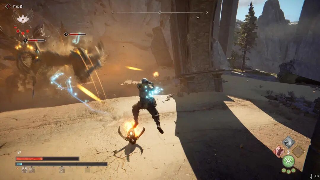 驾驭狂沙在沙漠中跑酷是游戏的卖点之一,在获得拳铠后即可操控沙子在沙地中滑行,看似炫酷的能力在大多时间只是用来赶路,到了石板路或城中就无法使用直接无法使用,只有在特定剧情场景或是坡地滑行的才会有所加速。