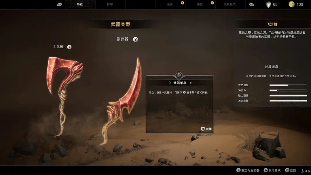 在获得拳铠后主角可以使用飞沙鞭、断沙斧、刃沙爪三种武器,战斗过程中可同时装备主、副两种武器,两种武器都有各自相对应的按键用来连段。对比同类游戏本作可使用的武器过少,获得武器的过程也没有狠令人印象深刻,并且在游戏的前期就轻松获得全部的三种武器也令本作后期的新鲜感大大减少。