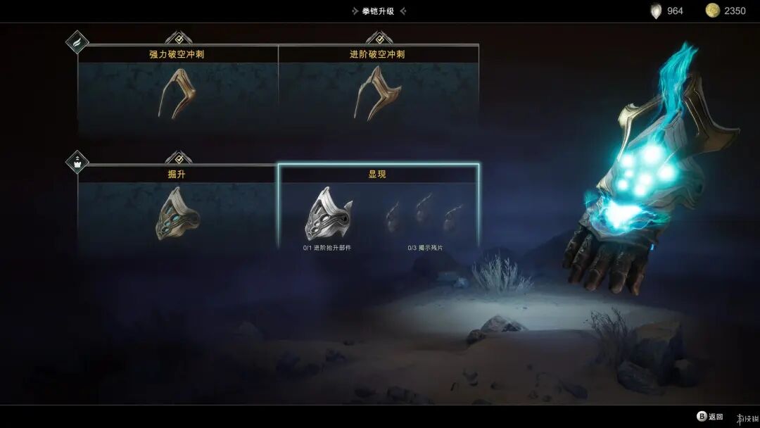 除此之外游戏中拳铠本身也有两个项目可供玩家升级,破空冲刺升级后可以提升在空中连续冲刺的次数,掘升在升级后操控沙子抬起更大的物体。二者的升级更像是用于推动剧情,在前期的剧情中主角被一扇巨大石门挡住去路,抬起石门需要提升自己掘升能力,而获得掘升拳铠部件则需要升级破空冲刺越过断桥....
