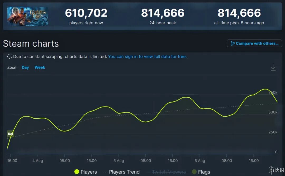 三年之期已到,让众多玩家翘首以盼的《博德之门3》终于迎来了正式版的更新发售,就在上周日晚上,这款CRPG的Steam同时在线人数已经来到了81万,其热度可想而知。
