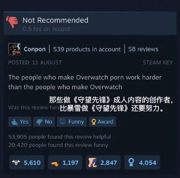 在9%的总好评率下,《守望先锋2》的国区好评率更是只有相当惨淡的3%。大伙也丝毫没有掩饰自己才华的想法,在评论区开始了创作。