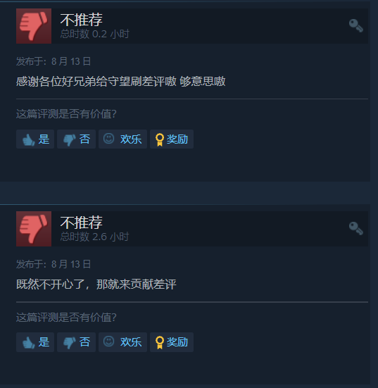 说真的,三国杀玩家这几年过得也确实不容易,一方面,他们在玩游戏的同时努力劝退更多新玩家,另一方面,他们还得努力给游戏刷差评,帮《三国杀》稳住steam差评榜首的地位——为此还会像上面那样,时不时被其他游戏的玩家所要挟。