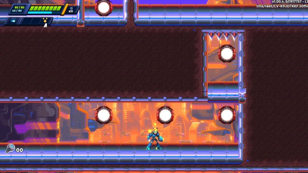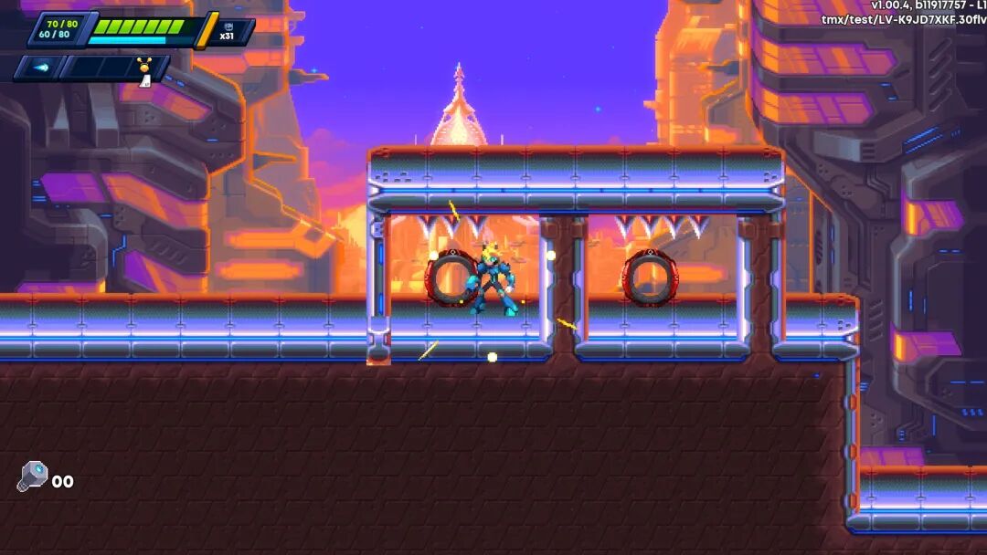 即便玩家坠入岩浆以及尖刺坑这样的“即死陷阱”,也只是会掉一个血槽,然后被挪移到这段路的开始。和传统的洛克人相比,《30XX》在给出一命通关这样的硬核前提下,在关卡中又尽可能减少了角色突然死亡的可能。