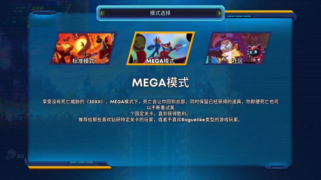 虽然打从一开始,《30XX》就被定义为洛克人+Roguelike,但实际上游戏本身依然给予玩家相当大的可选空间。在正式进入游戏前大伙可以选择以标准模式或是“MEGA”模式进行游玩。