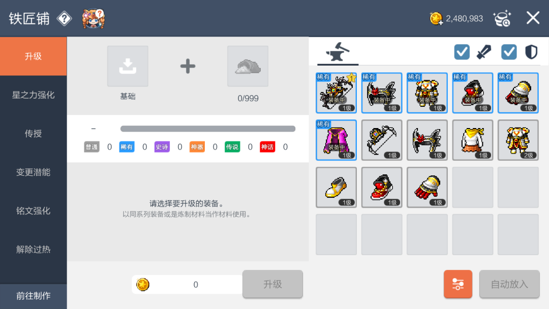 在铁匠铺中,玩家可以给装备升级、强化,还能够更改装备的潜能,以及给装备刻上铭文。