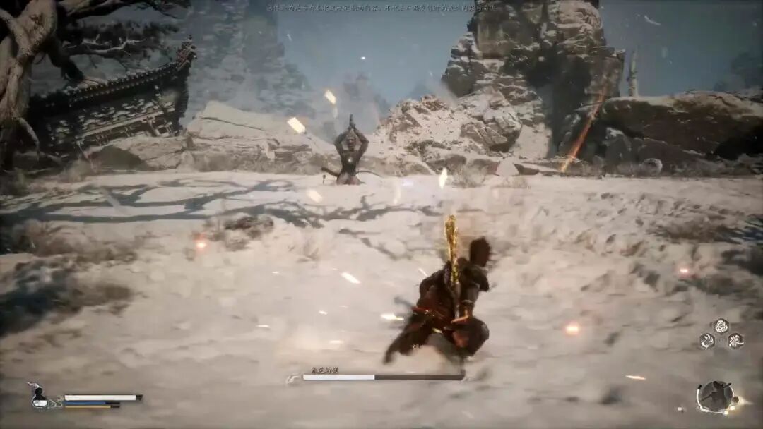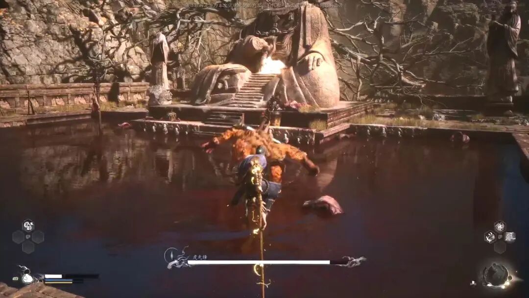 第二个头目挑战是《西游记》混世四候之一的赤尻马猴,场景为官方发布的12分钟UE5实机测试集锦中的批霜道。本关在头目挑战前加入了杂兵战和上香点,这里的上香点直白的说就是soullike中的篝火,上香后可以调休恢复体力补充葫芦并且刷新妖怪,还可以调整当前携带的法术。