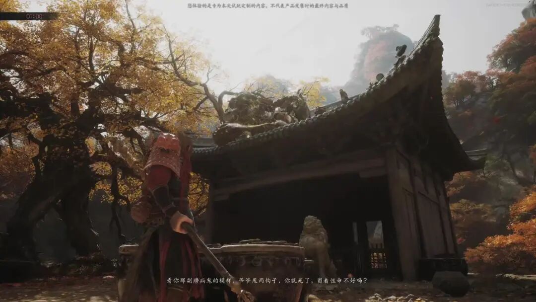最后就是本次demo中唯一的独立关卡紫云山了,关卡拥有完整的地图要素,进入后经过一小段路进入山谷后切换远景由于场景过大会出现明显的掉帧,这次掉帧不同于百足虫击飞头骨会伴有明显的卡顿。在遇到赤蛇交代关卡背景和注意妖怪用毒后关卡才算正式开始,通过吊桥后出现了demo的第一个分支,向右走是挑战赤蛇提到的毒敌大王,其躺在寺庙上悠闲的喝酒看到天命人后提醒不要在此游荡以免碰坏酒坛,破坏酒坛后战斗开始。