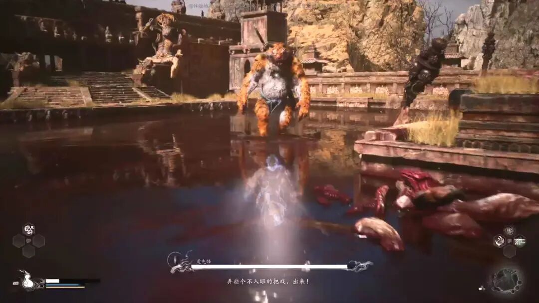 第三场头目是虎先锋,场景为官方发布3分钟拜年混剪中的卧虎寺。这次的头目挑战前加入了开宝箱环节,在探索中玩家可以找到一个宝箱打开后可以获得金鼎药。挑战开始后进入剧情虎先锋会埋怨玩家东西送得迟耽搁了大王的练功进度,随后场景被限制在一个血池中,由于场地变小再加上虎先锋招式范围大伤害高难度一下就上来了。除了加入剧情从这场BOSS战开始台词交互出现,当使用隐身规避技能时虎先锋会嘲讽是不入流的把戏,玩家被打倒会说猴头留着下酒,头目的性格一下变得更加鲜活、立体。