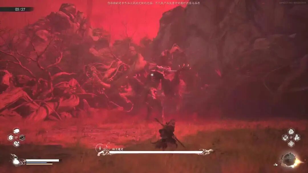 赤尻马猴是这次试玩六个头目中令我印象最深的一个,原因是我与同事在体验的过程中发现二人所挑战的赤尻马猴有所差异,笔者挑战的赤尻马猴与实机演示中的无异,而一旁的同事的屏幕中却出现了长着黑色翅膀的马猴。在数次的尝试后发现赤尻马猴被打倒半血后会向玩家求饶,如果你将其放走在后续的战斗中赤尻马猴就会化为长有黑色翅膀的形态,这也符合《西游记》原著中赤尻马猴“晓阴阳,会人事,善出入,避死延生。”的描写。