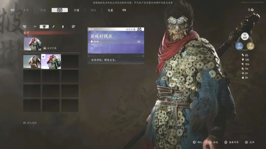 紫云山还为我们展示了游戏的装备系统和采集系统,先说采集在紫云山大多数的妖怪都会释放毒属性的招式,山里采集获得的树珍珠可以用来解读,其他的采集到的植物对应的效果也有所不同。装备方面demo中展示了两套,昆蚑拥有套装效果另百戏套则没有,值得注意装备只有品级上的区别,品级会影响数值不会增加词条,也就是说本作不是一个刷子游戏。值得一说的细节,装备满是铜钱的百戏衬钱衣后随着跳跃会铜钱会发出声响,昆蚑戗金甲则没有任何声音。