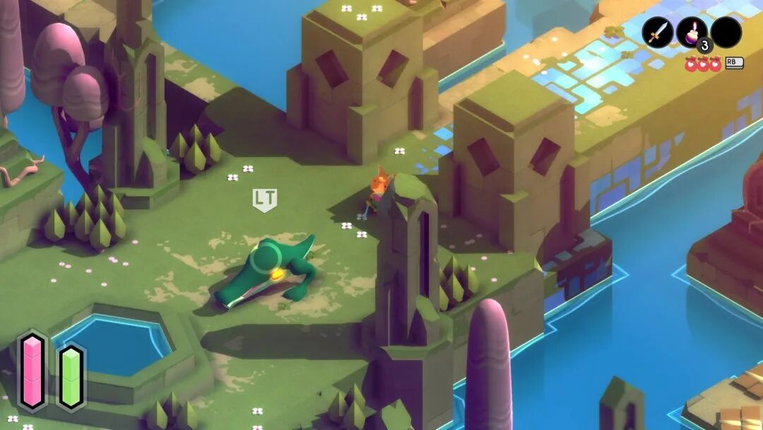 《Tunic》包含了许多内容,仅仅将其描述为类魂游戏可能不足以展现游戏的创意和野心。除了明显受到《塞尔达传说》的启发,特别是在谜题方面,这款独立游戏的战斗系统无疑更偏向于类似《黑暗之魂》的游戏。游戏包含了与这些类型的游戏相对应的核心基础要素:闪避翻滚、盾牌防御和敌人招式的提示。甚至还有类似原素瓶的物品,可以恢复生命。