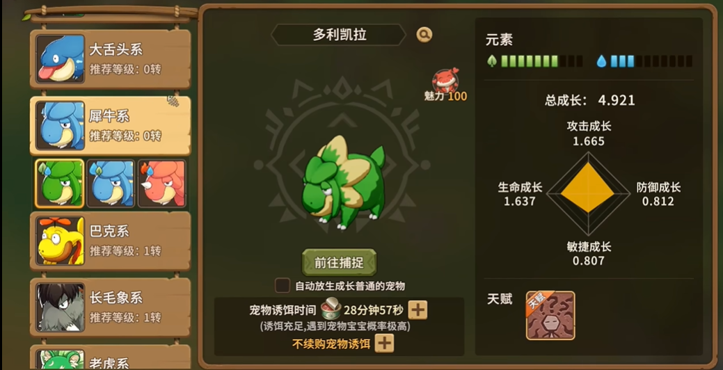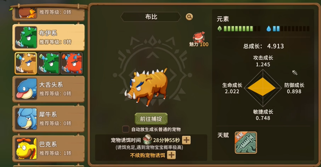 《石器时代:觉醒》也和当初一样,将宠物养成当成了最为核心的玩法之一。捉宠玩法的流程并不复杂,就是通过战斗捕捉幼年宠物,然后进行自己的培养计划。游戏中玩家所获取的每一只宠物都会有着不同的元素属性、成长数值以及成长上限。