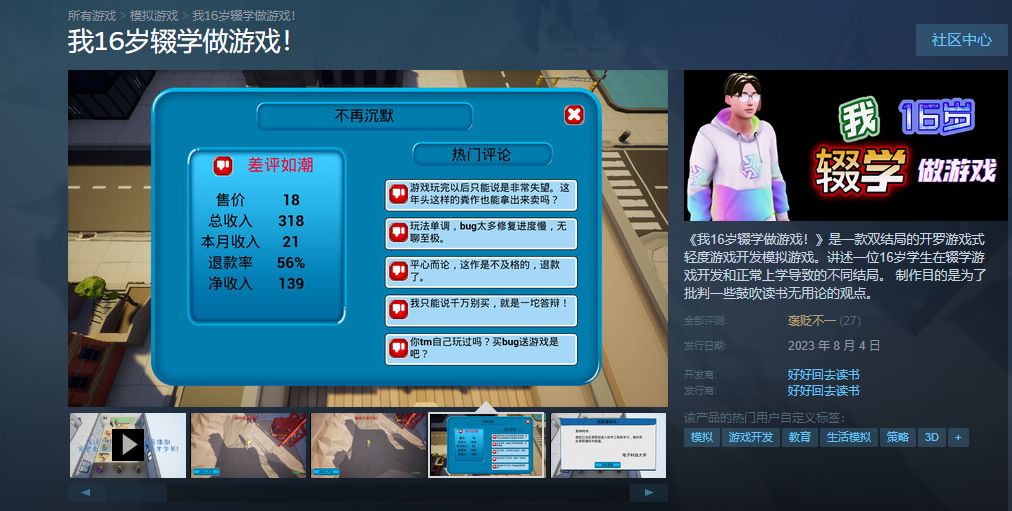 前些时候,steam上甚至出现了一个名为《我16岁辍学做游戏》的游戏,发行商则名为“好好回去读书”。尽管这款游戏在质量上同样也算是彻头彻尾的“垃圾”。