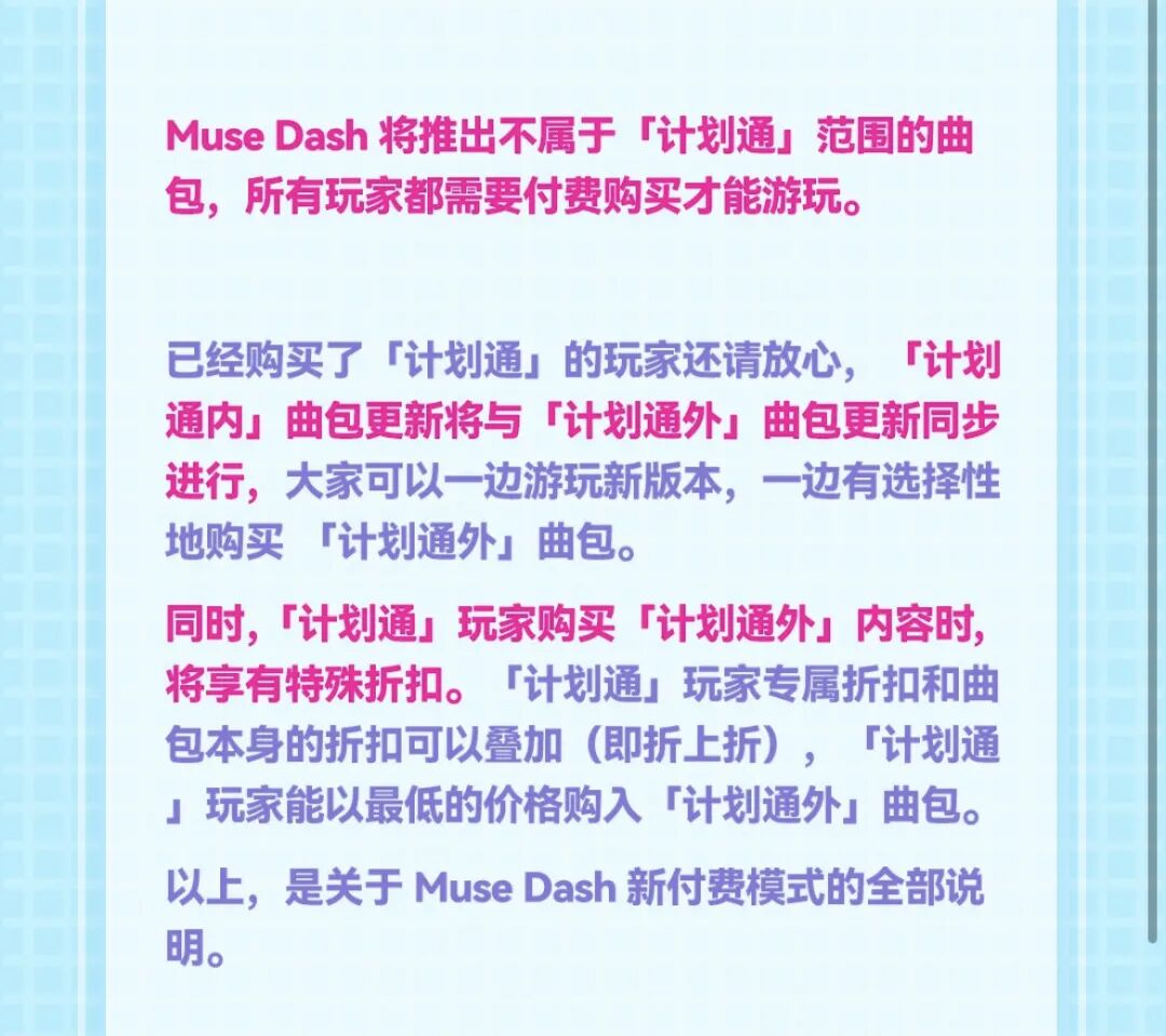 在原本号称只要购买了名为“计划通”DLC后就能永久免费所有歌曲更新的前提下,《喵斯快跑》想要推出需要额外付费的歌曲,之后很快遭到玩家在评论区以及steam平台上进行差评轰炸,最终光速滑跪,宣布拥有“计划通”DLC的玩家依然能够免费游玩所有歌曲。
