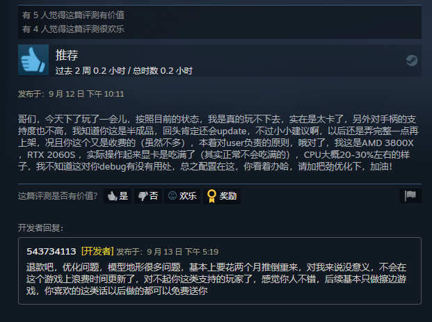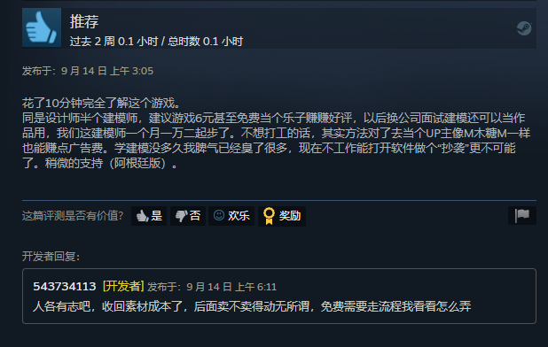但这位名叫“野生建模师”的开发者不同,他对于玩家给出差评的回应概括说来只有两点: